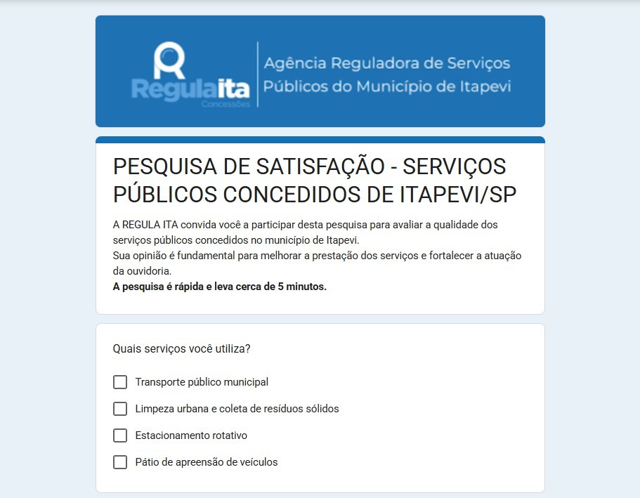 A Agência Reguladora dos Serviços Públicos de Itapevi publicou um formulário online para pesquisa de satisfação dos serviços públicos municipais.